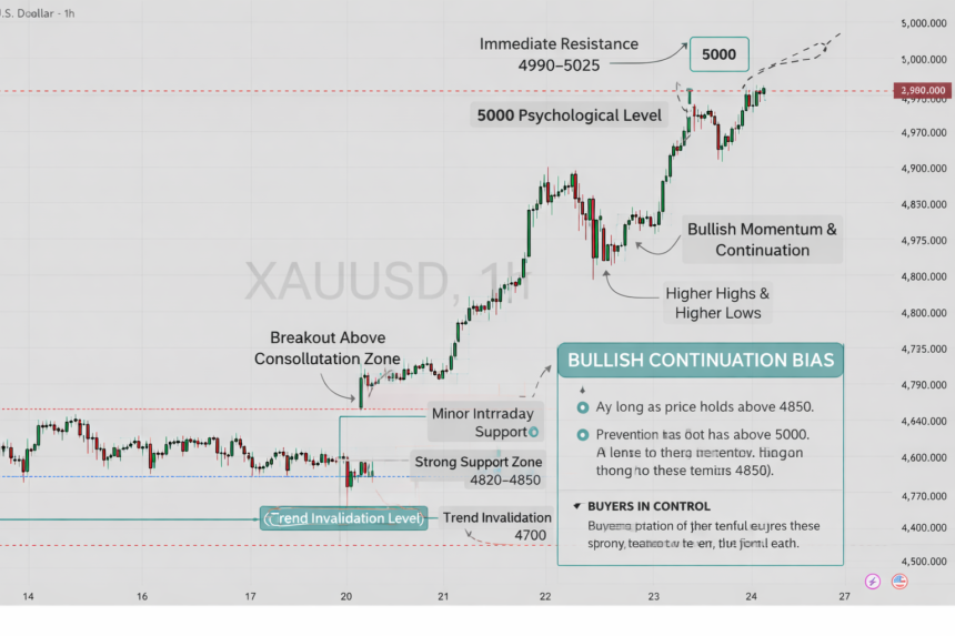 Gold (XAUUSD) continues to demonstrate impressive bullish strength as price action on the 1-hour timeframe confirms a well-established uptrend. Buyers remain firmly in control, pushing prices toward key psychological resistance…